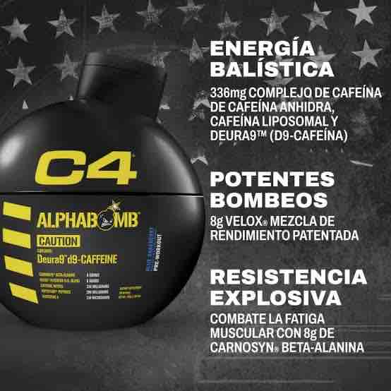C4 ALPHABOMB es un pre-workout diseñado para los atletas que buscan máxima energía, enfoque extremo y bombeo muscular explosivo. Su fórmula avanzada incluye ingredientes de última generación, incluyendo Deura9™ d9-Caffeine, una forma ultra potente de cafeína que incrementa la energía sostenida sin caídas repentinas.